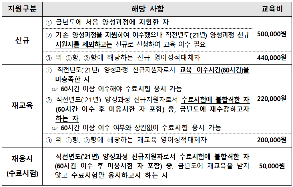 처음 경영지도사 양성과정에 지원하는 자의 교육비는 50만 원이고, 재교육 지원자의 교육비는 22만 원, 수료 시험 재응시자의 교육비는 5만 원입니다.