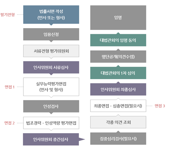 현재 법관, 즉 판사 임용 절차는 법조경력을 기준으로 '일반 법조경력자 법관 임용절차'와 '전담법관 임용절차'라는 두 가지 종류로 나누어 진행하고 있습니다.