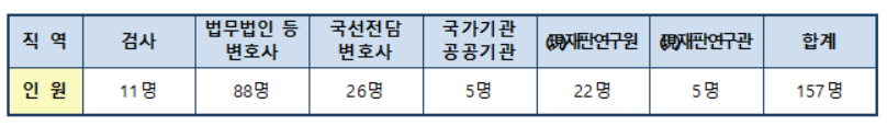 2021년 판사 임용 합격자는 총 157명으로 법무법인 등 변호사 출신이 88명으로 가장 많으며, 국선전담 변호사 출신이 26명, 재판연구원 출신이 22명이었습니다.