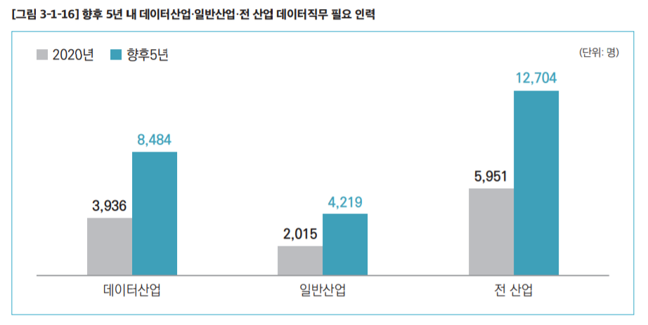 한국데이터산업진흥원이 발행한 2020년 데이터산업 백서에 따르면 향후 5년 내 데이터 산업을 포함한 전 산업에서 데이터 직무 필요 인력은 12,704명인데, 2020년까지 종사자는 5,951명에 불과합니다.