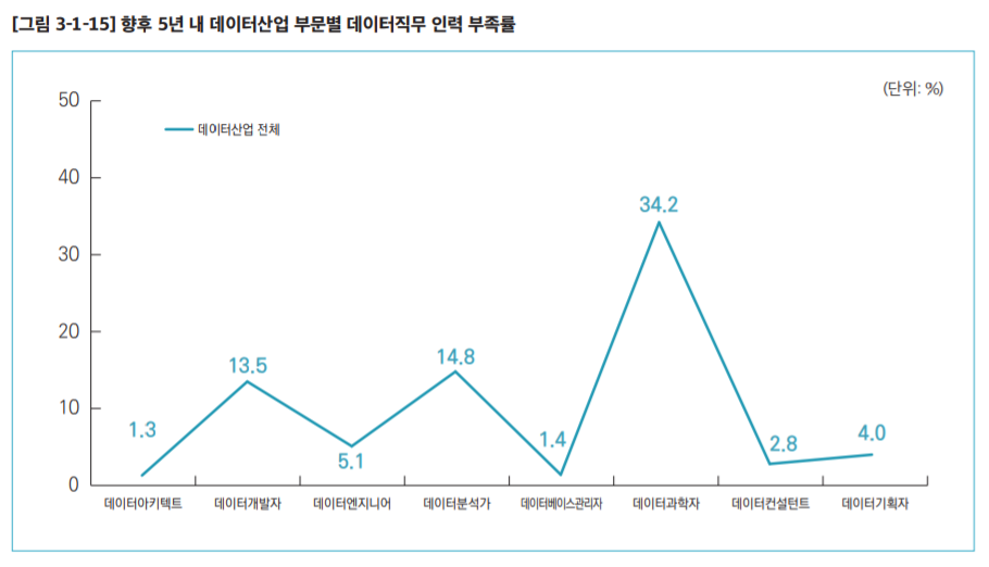데이터 직무 인력 중에서도 인력 부족률이 높은 직무는 데이터 과학자(34.2%) 다음으로 데이터 분석가(1.4%)입니다.