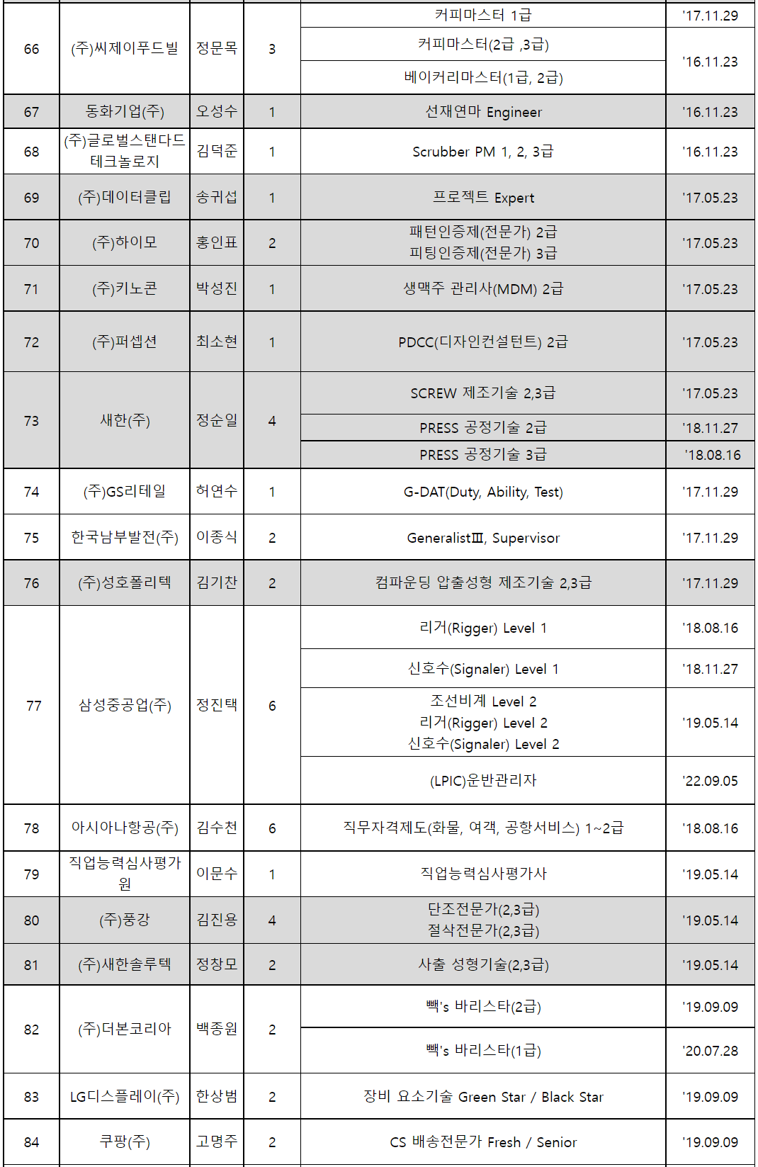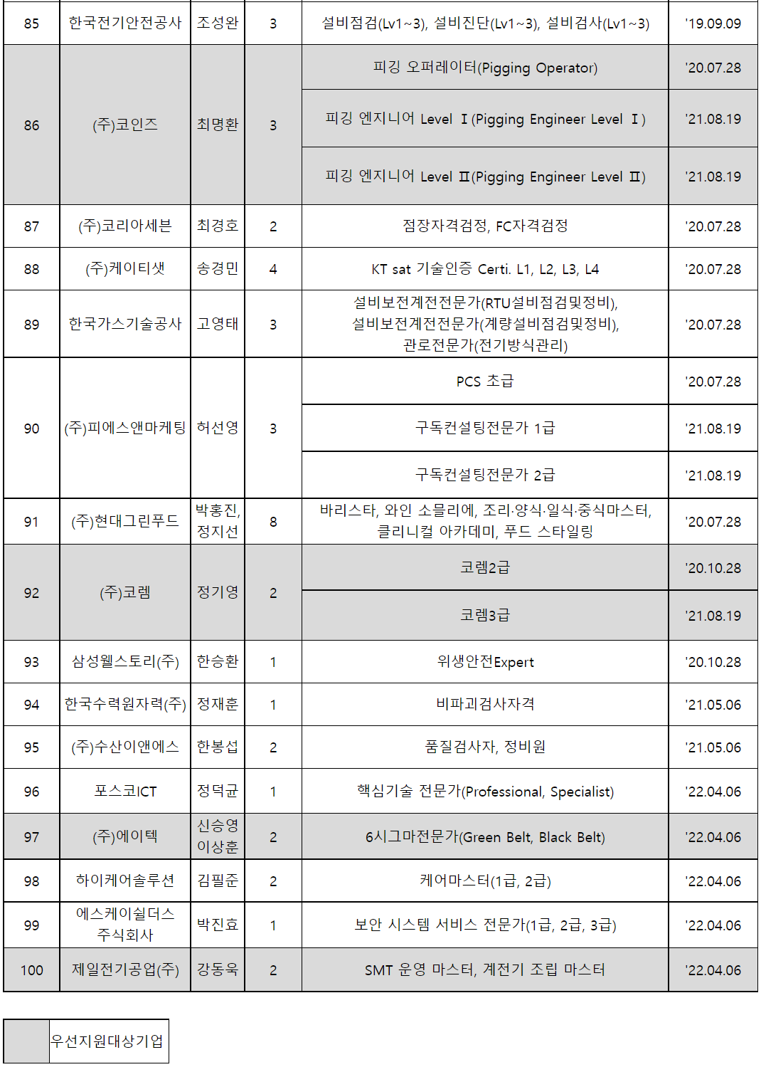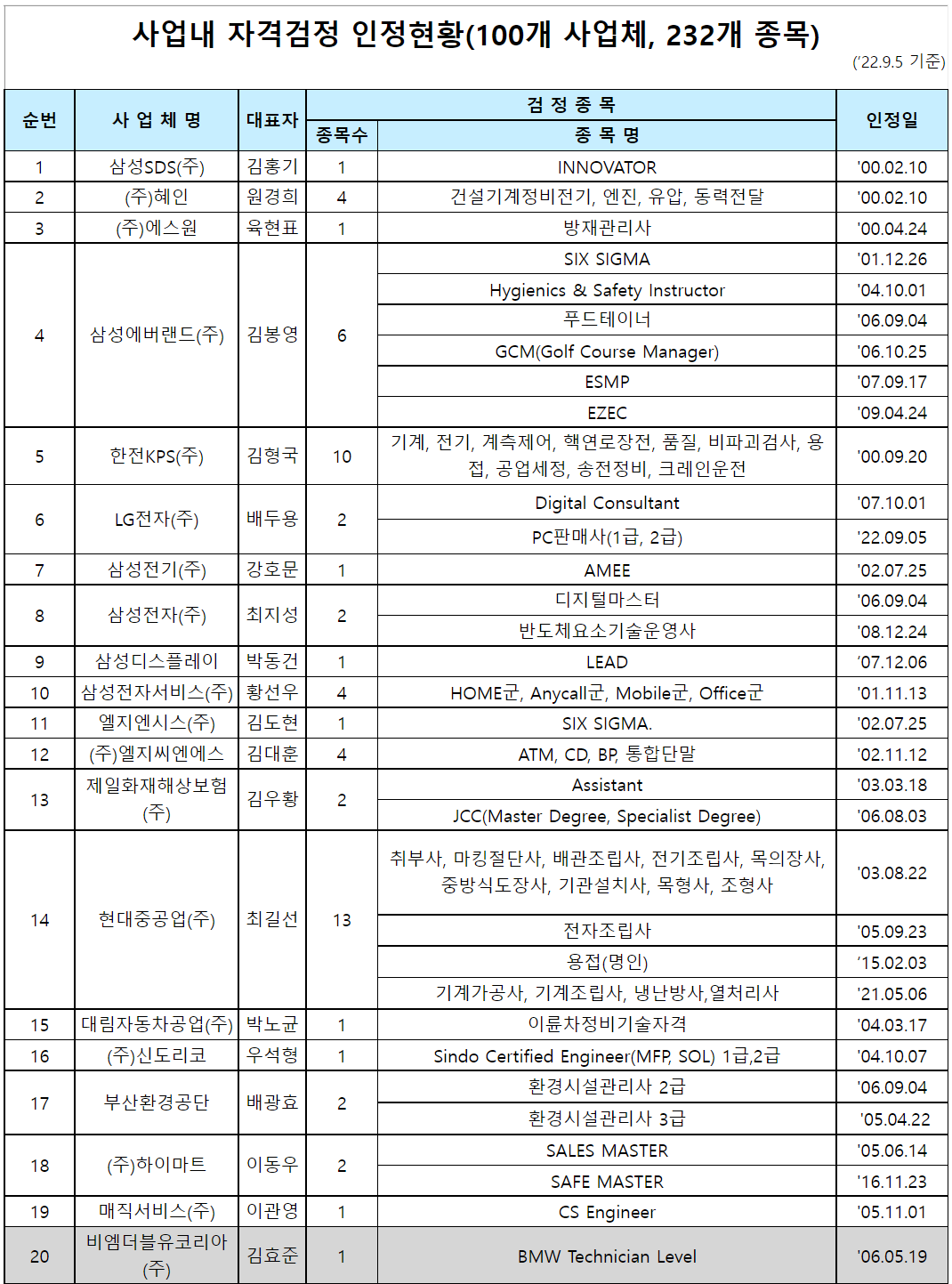 2022년 9월 5일 기준 사업내자격으로 인정된 자격증은 100개 사업체에서 232개 종류(종목)입니다.