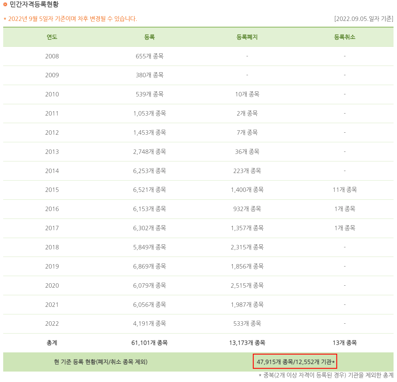 현재(2022년 9월 5일) 주무부 장관에 등록된 민간 자격 종류는 47,915개 이고, 자격증을 관리하는 기관은 12,552개 기관입니다.