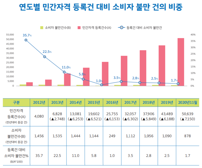 등록 민간자격증은 자격제도를 운영하는 기관의 역량에 따라 국가자격증만큼 인정을 받는 자격증도 있고, 몇 년 시행되지도 못한 채 폐지되는 자격증도 많습니다. 상당한 비용과 시간을 들여 자격증을 취득하는 국민이 부실한 교육과 운영으로 피해를 보는 일이 종종 발생하고, 매년 등록 민간자격증에 대한 소비자의 불만이 증가하고 있습니다.