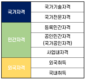 자격증 종류는 자격증 관리·운영 주체에 따라 크게 ① 국가(대한민국)가 관리·운영하는 국가자격증, ② 국가 이외의 민간에서 관리·운영하는 민간자격증, ③ 외국이나 해외 민간단체가 관리·운영하는 외국 자격증의 3가지로 분류할 수 있습니다.