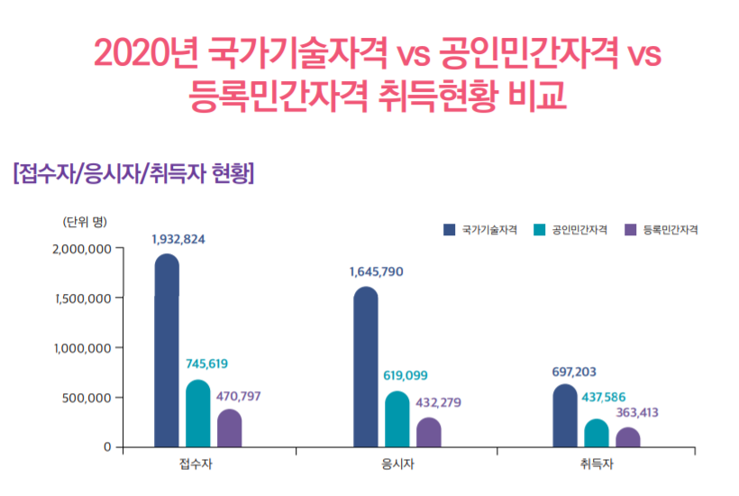 등록 민간자격증은 국가기술자격이나 국가공인자격에 비해 합격률이 높아 취득하기 쉬운 편이라 매년 응시자가 꾸준히 증가하고 있습니다.