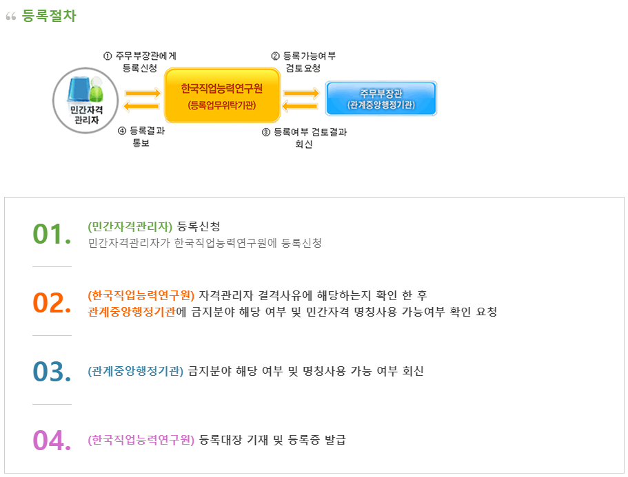 개인이나, 법인 등 국가 이외의 민간에서 자격증을 만들어 관리·운영할 때는 자격기본법에 따라 주무부장관에 등록하도록 되어 있습니다.
