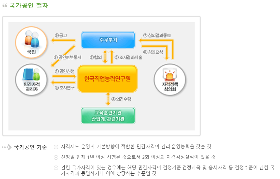 국가공인자격증이란? 우리가 흔히 국가공인자격증이라 부르는 자격증은 국가가 아닌 법인, 단체 등의 민간 기관에서 운영하는 자격증 중에서 국가의 공인을 받아 신뢰성을 확보한 자격증을 의