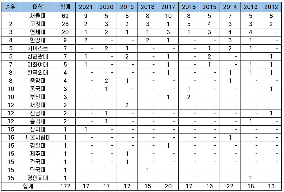 | 순위 | 대학 | 2012~2021 10년간 누적 합격자 |