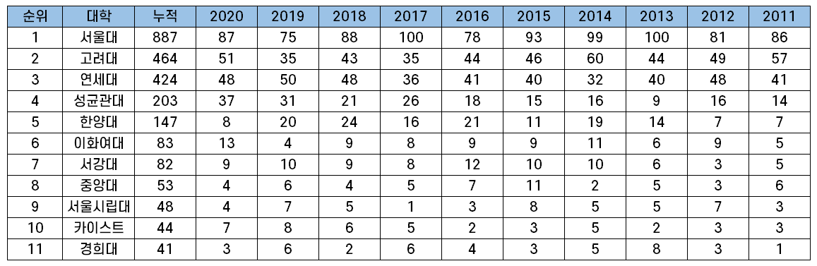 | 순위 | 대학 | 2011-2020 누적 |
