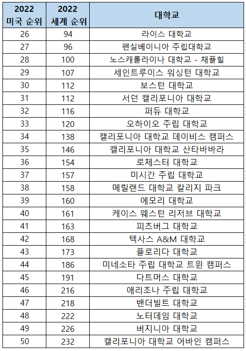 | 50 | 캘리포니아 대학교 어바인 캠퍼스 | University of California, Irvine |