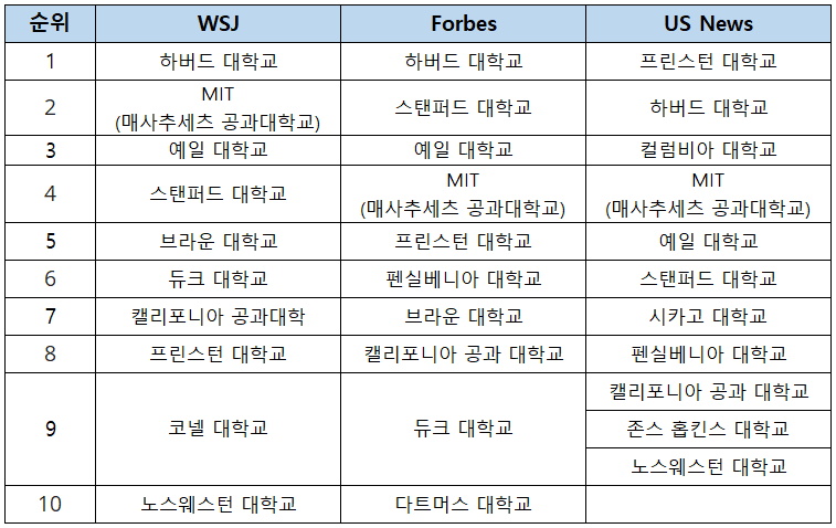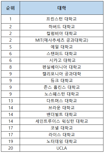 US. News 가 발표하는 미국 대학 순위는 올해도 지난해에 이어 프린스턴 대학교가 392개 대학 중에서 1위를 차지했고, 하버드 대학교, 컬럼비아 대학교, MIT가 공동 2위에 올랐습니다. 프린스턴 대학교는 11년 연속 1위자리를 굳건히 지키고 있습니다.