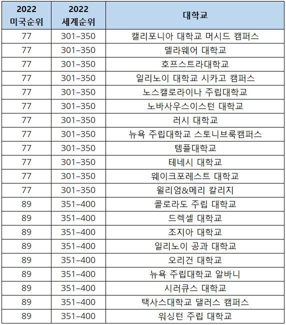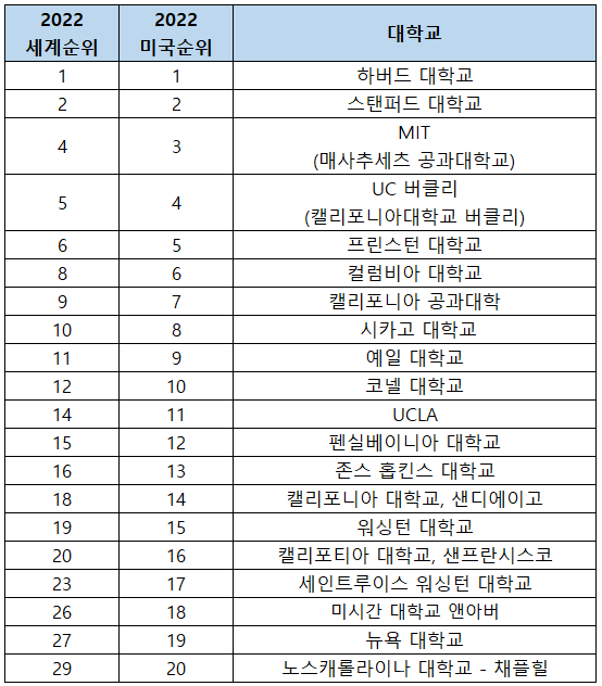이번 포스팅에서는 먼저 미국 대학 순위 중 가장 많은 사람들이 대학 입시 자료를 삼고 있는 유에스 뉴스 미국 대학 랭킹(2022 U.S. News Best Colleges Ranking)을 살펴본 후 세계 대학 평가기관인 THE, QS, ARWU에서 평가한 미국 대학 순위를 비교 정리했습니다.
