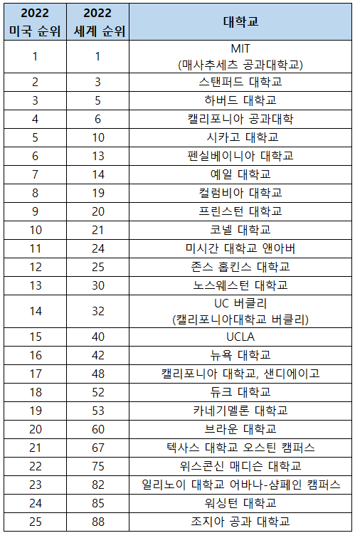 | 25 | 텍사스 대학교 오스틴 캠퍼스 | University of Texas at Austin |