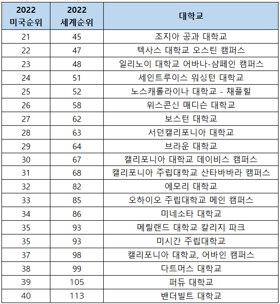 | 21 | 텍사스 대학교 오스틴 캠퍼스 | University of Texas at Austin |
