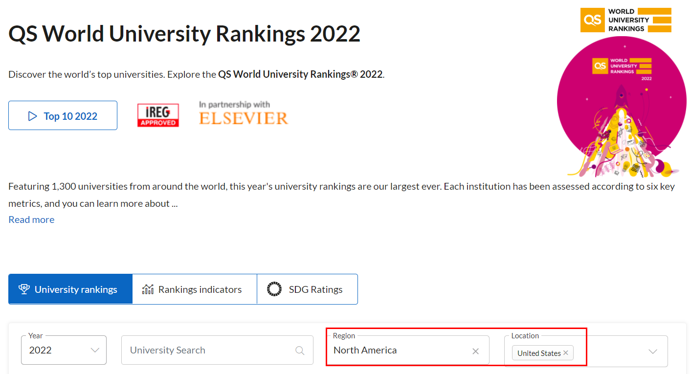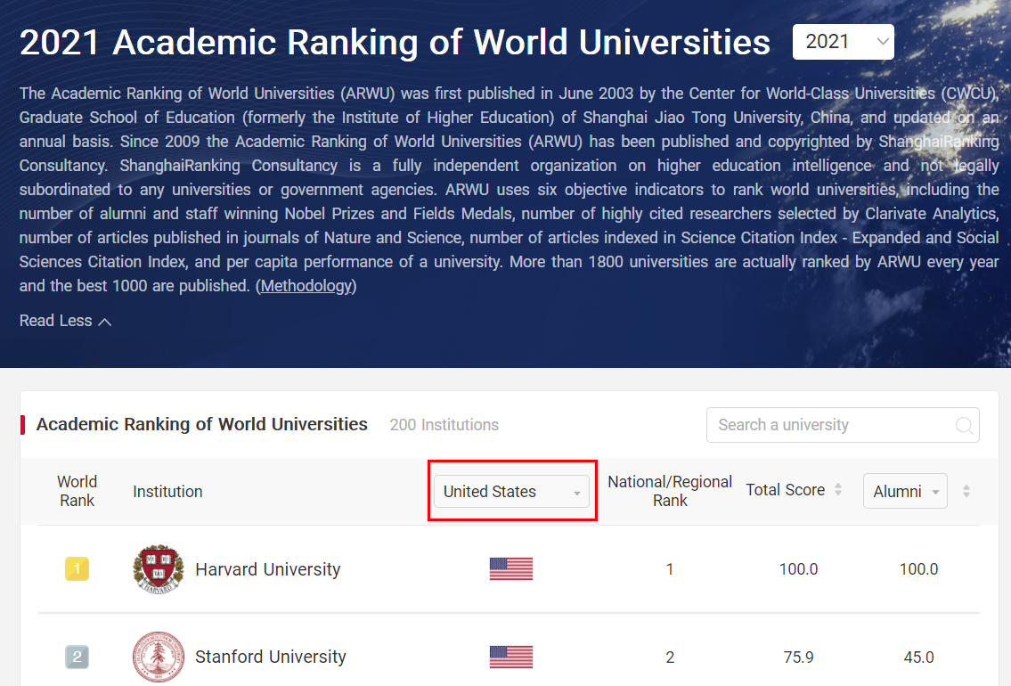2021년 ARWU(세계 대학 학술 순위) 세계 대학 랭킹에는 200개 미국 대학의 순위가 포함되어 있습니다. QS와 마찬가지로 미국 대학 순위를 따로 발표하고 있지는 않고, 전체 대학 순위에서 지역 검색을 통해 미국 대학 순위를 확인할 수 있습니다.