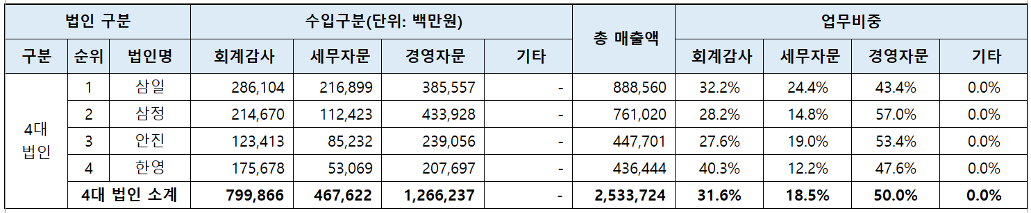 | 사업부문 | 삼일 | 삼정 | 한영 | 안진 | ||||