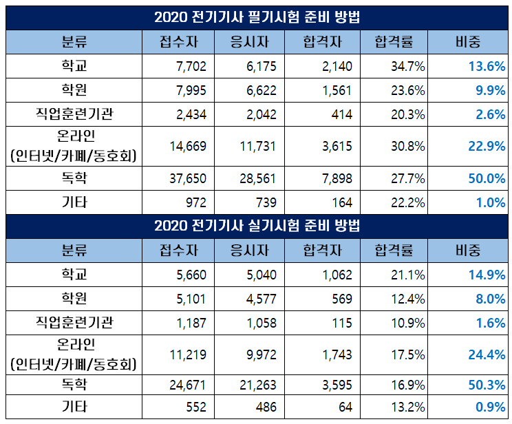 2020년 전기기사 필기시험 합격자 중 50%가 독학, 22.9%가 인터넷강의 등 온라인을 활용해서, 13.6%가 학교에서 시험을 준비했습니다. 학원을 다니면 준비한 합격자가 전체 합격자의 9.9%, 직업훈련기관을 통해 준비한 합격자가 2.6%였습니다.