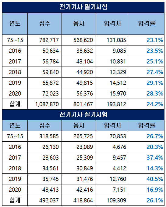 정보처리기사는 필기시험과 실기시험 모두 합격률이 50%내외로 난이도가 그렇게 높지 않은 자격증인 반면 전기기사는 아래에서 자세히 살펴보겠지만 필기와 실기 모두 합격률이 20~30% 정도로 낮습니다 기사 자격증의 필기와 실기시험 평균 합격률이 40%인걸 감안하면 전기기사가 상당히 합격하기 어려운 시험인걸 알 수 있습니다. 그럼에도 불구하고 왜 이렇게 많은 사람들이 점점 더 전기기사 자격증을 취득하려고 하는 것일까요?