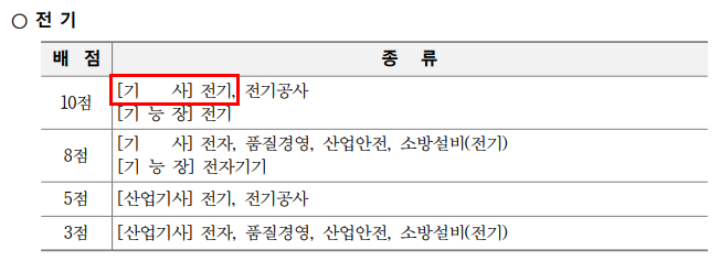 하지만, 자격증 보유시 가점에 있어서는 차이가 있는데 전기기사 소지시 가장 높은 가점인 10점을 받을 수 있습니다.