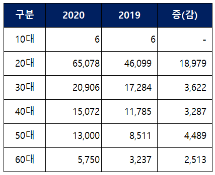 2019년과 2020년 필기 및 실기시험을 접수한 수험생의 연령대는 아래 표와 같습니다. 10대를 제외한 모든 연령대에서 전기기사 자격증을 취득하고자 하는 수험생이 늘었지만, 그 중 20대 수험생이 1만 8천여 명이나 증가했습니다.