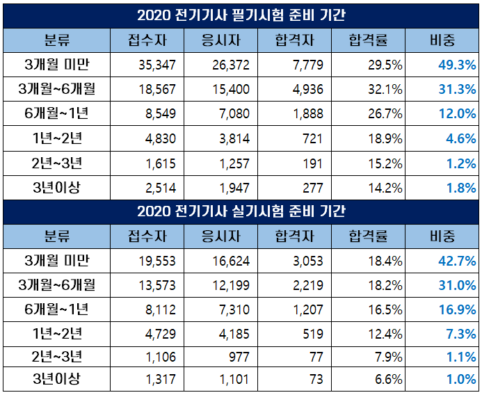 필기시험과 마찬가지로 2020년 전기기사 실기시험 합격자 중에는 공부기간 3개월 미만인 수험생이 전에 42.7%로 가장 많았습니다. 이어서 3개월~6개월 실기시험을 준비하고 합격한 응시생이 전체 합격자의 31%로 많습니다.
