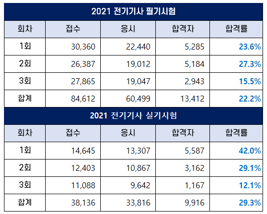 2021년에는 전기기사 필기 2회 시험의 합격률이 27.3%로 가장 높았고, 가장 어려웠던 3회차는 절반에 가까운 합격률 15.5%를 기록했습니다.