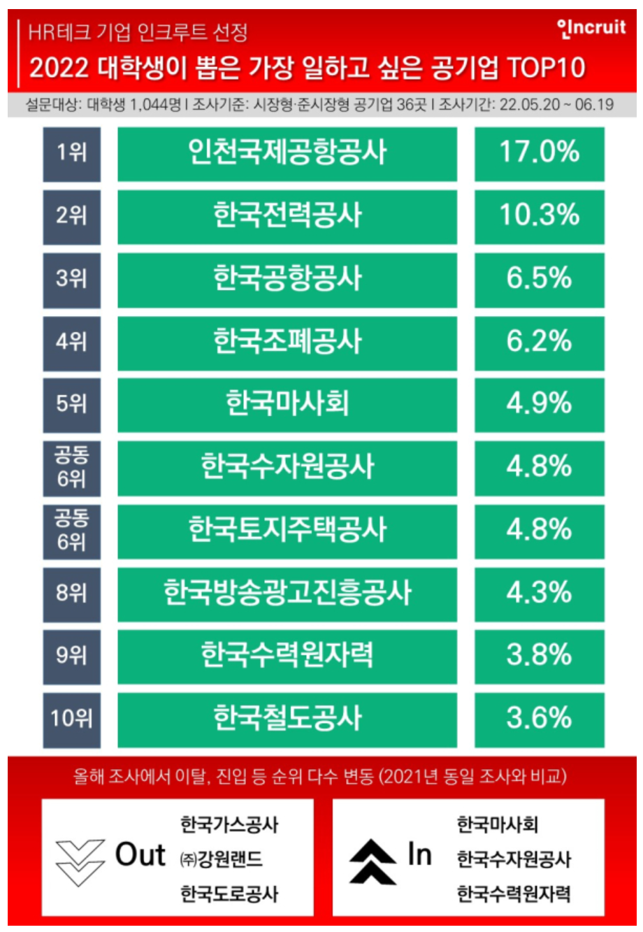 인크루트는 대학생 1,044명을 대상으로 설문조사를 해 2022년 대학생이 가장 일하고 싶은 공기업 TOP10을 선정했습니다. 2021년 TOP 10과 비교하면 한국방송광고진흥공사, 한국수자원공사, 한국수력원자력공사가 새롭게 순위권으로 진입했고, 한국가스공사, 강원랜드, 한국도로공사가 순위권밖으로 밀렸습니다.