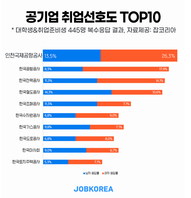 2021년 잡코리아는 대학생과 취업준비생 445명을 대상으로 가장 취업하고 싶은 공기업을 조사해 가장 선호하는 공기업 TOP 10을 선정했습니다(2020년에는 TOP 7까지만 선정했습니다).