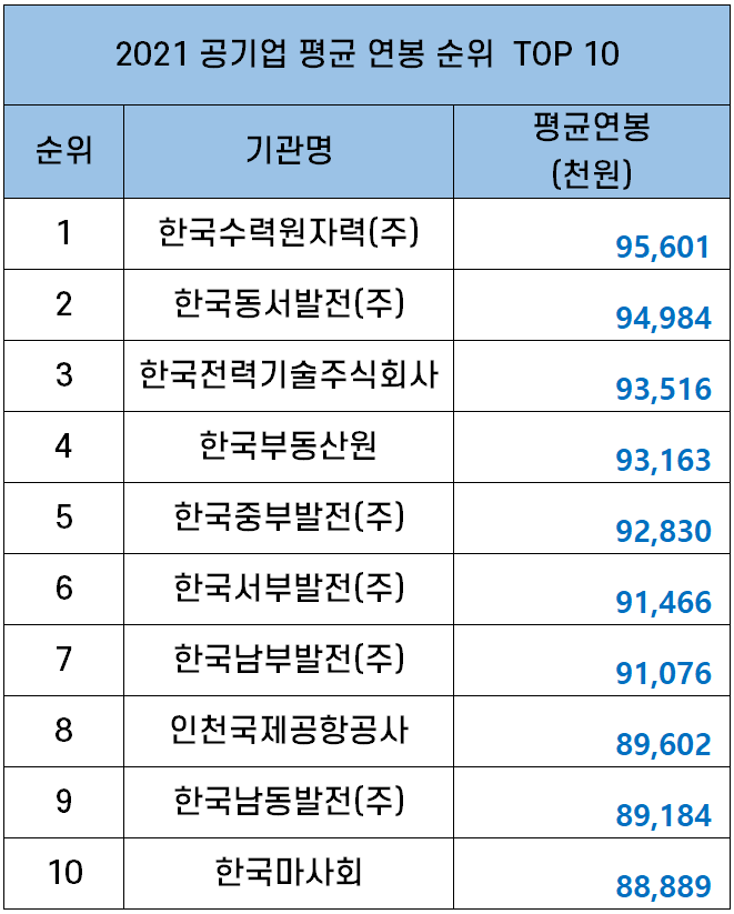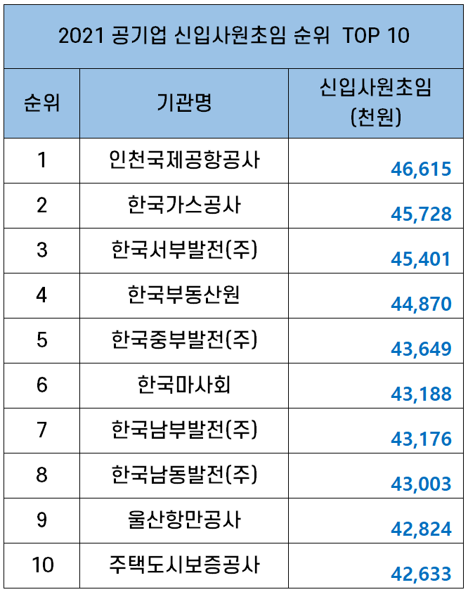 공기업 신업사원 초봉 순위는 아래 표로 정리했는데요. 2021년 한국광물자원공사와 한국광해공단을 통합해 설립한 한국광해공업공단의 경우 2021년 신입사원 초임을 공시하지 않아 순위에 포함되지 않았습니다.