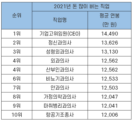 이번 포스팅에서는 2021년 9월 10일 현재 가장 최근에, 공신력 있는 기관에서 조사한 돈 많이 버는 직업의 순위를 정리했습니다.