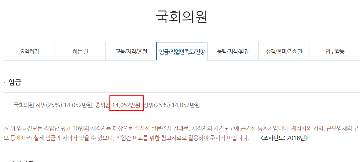 2019년 돈을 많이 버는 직업 순위 1위였던 국회의원이 50위 안에도 들지 못한 것으로 봐 조사 대상에서 제외된 것 같습니다. 워크넷에 공시된 2018년 기준 국회의원의 평균 연봉은 1억 4천5백만 원이었습니다.