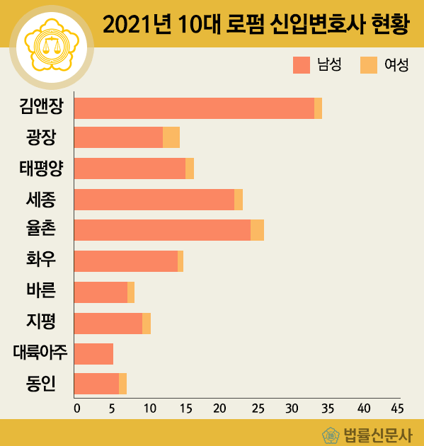 2020년 대형 로펌에 입사한 232명 중 남성이 147명, 여성이 85명으로 남성의 비율이 많았습니다. 광장의 경우 신입 변호사 29명 중 절반이 넘는 17명이 여성 변호사였고, 동인도 13명 중 7명이, 바른도 14명 중 7명이 여성 변호사였습니다.