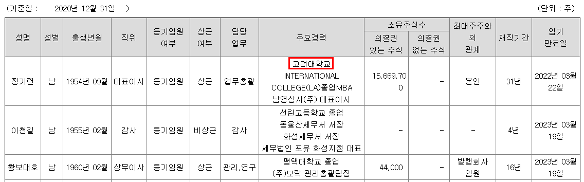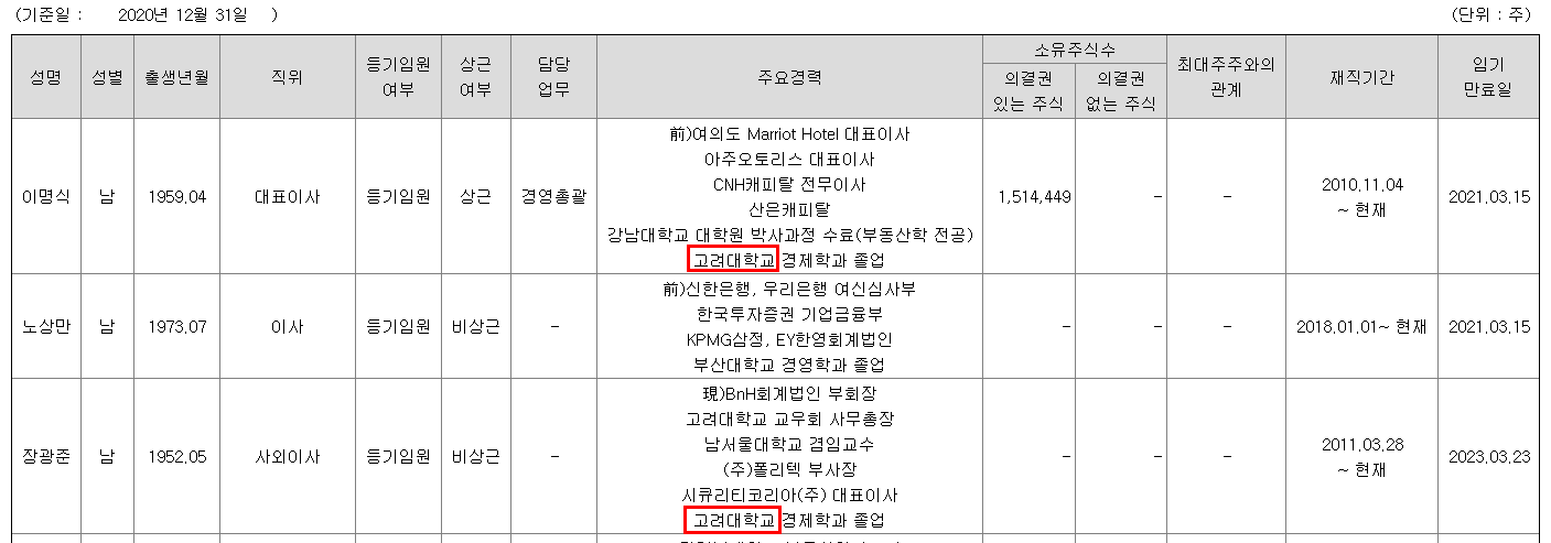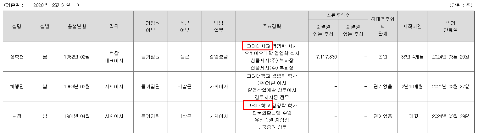 이유: 정학헌 대표이사와 서정 사외이사가 고려대 동문.
