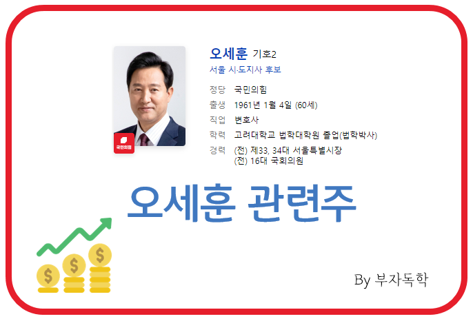 오세훈 후보는 고려대학교 법학과를 졸업하고 전 33대, 34대 서울특별시장을 역임한 바 있습니다. 이에 따라 오세훈 후보와 고려대 동문인 임원이 재임하고 있는 기업이나 서울시장 재임 시절 정책과 관련한 기업들이 오세훈 관련주로 분류되고 있습니다.