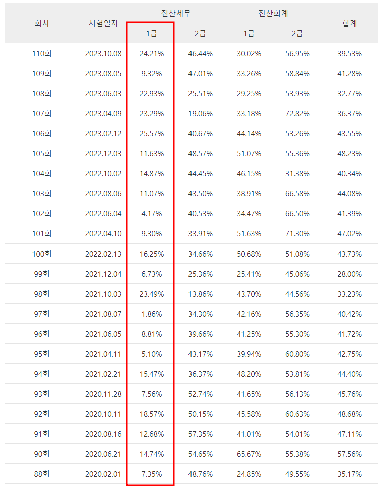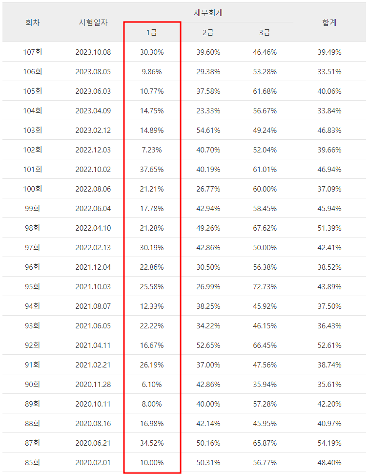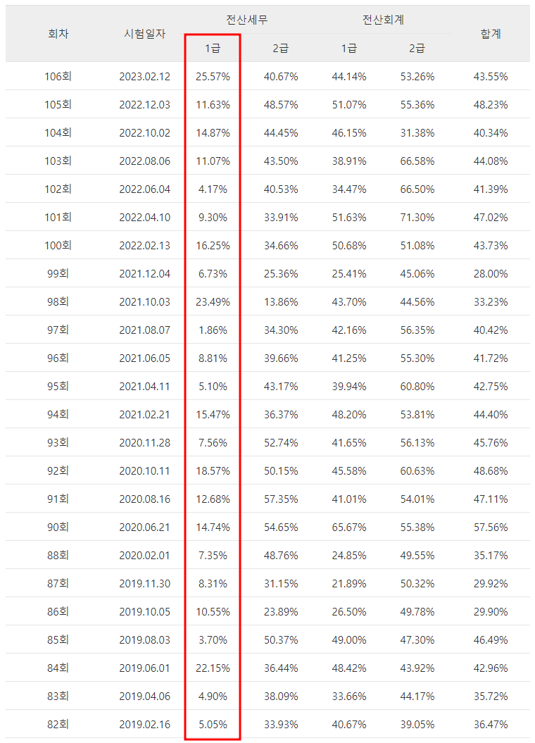 세무회계 1급도 합격률이 상당히 낮은데요 2020년 11월에 시행된 90회 시험에서는 6.10%, 2022년 12월에 시행된 102회 시험에서는 7.23%의 낮은 합격률을 기록하기도 했습니다.