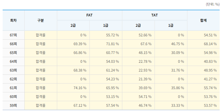 한국세무사회가 시행하는 시험과 비교하면 TAT 1급이 전산세무 1급, TAT2급이 전산세무 2급, FTA 1급이 전산회계 1급, FTA2급이 전산회계 2급과 난이도가 유사하다고 보면 됩니다.
