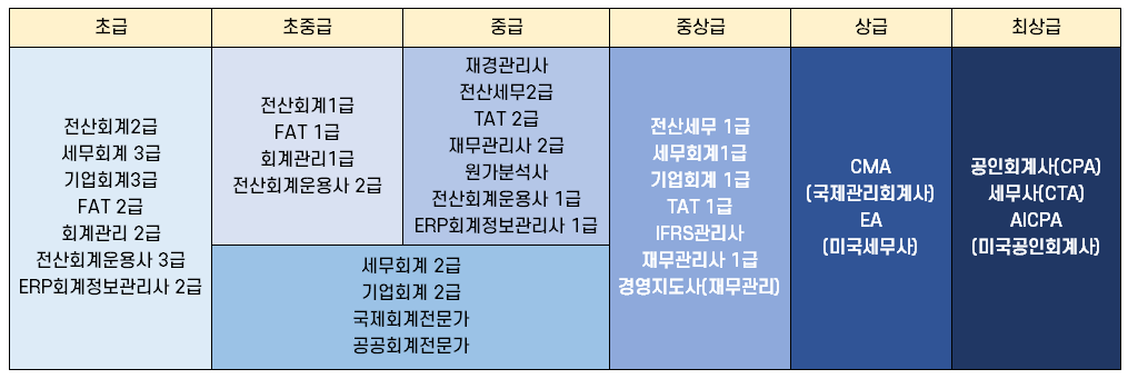 시험과목과 시험 범위와 깊이를 고려해 회계 자격증의 난이도를 초급부터 최상급까지 분류하면 아래 표로 정리할 수 있습니다.