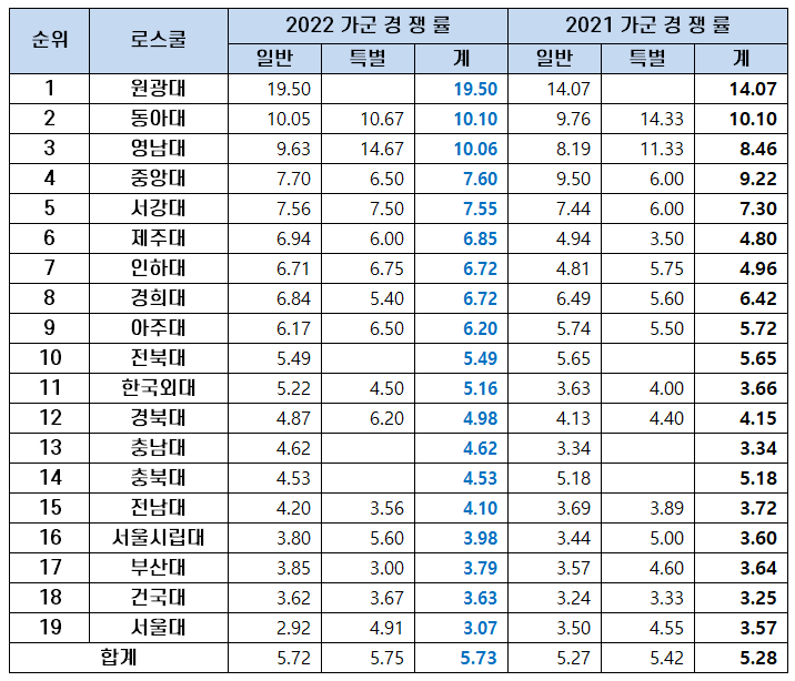 2022년 로스쿨 입시 가군에서는 19개 로스쿨에서 총 910명을 모집하는데 5,211명이 지원해 평균 경쟁률은 5.73대 1입니다.