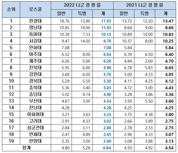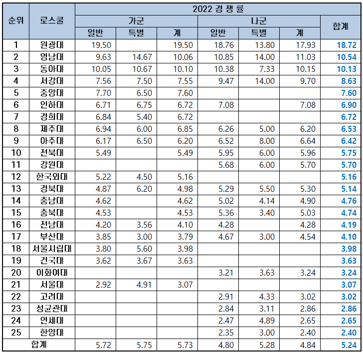 2022년 25개 로스쿨 입시 가군과 나군의 경쟁률은 아래 표와 같습니다. 가군의 경쟁률이 5.73대 1로 나군 경쟁률 4.84대 1보다 높습니다.