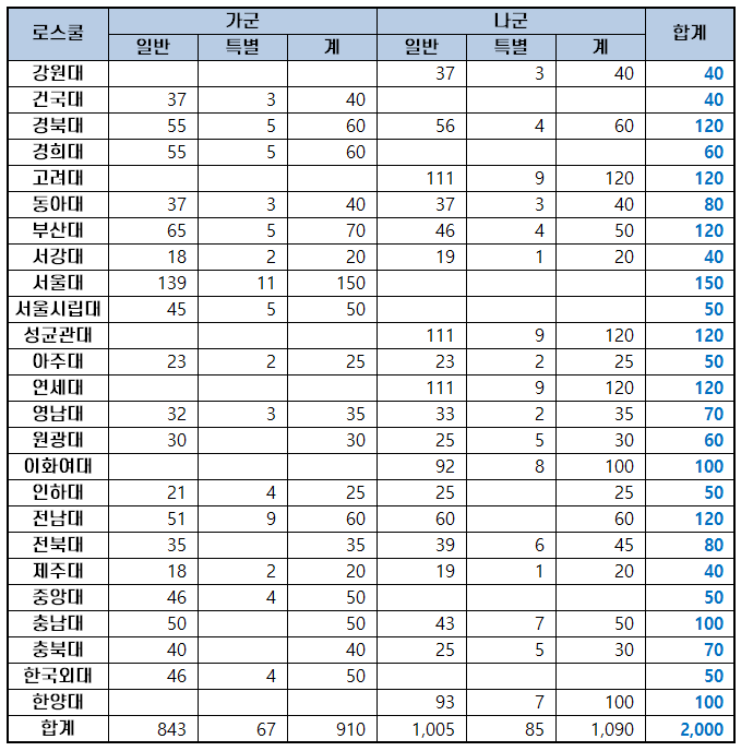 25개 로스쿨은 가군과 나군으로 나누어 입시 전형을 진행하는데요. 각 로스쿨 별로 가군과 나군에 모집하는 입학 정원은 아래 표와 같습니다.