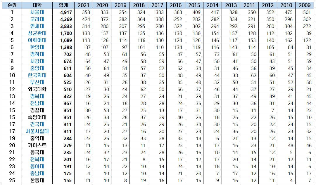 | 순위 | 대학 | 2009~2021년 누적 합격자 |
