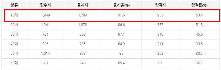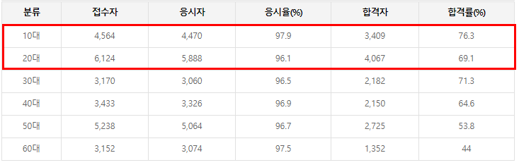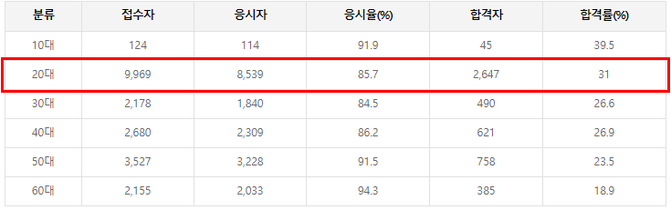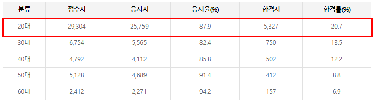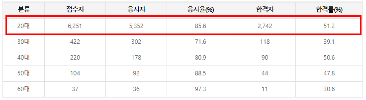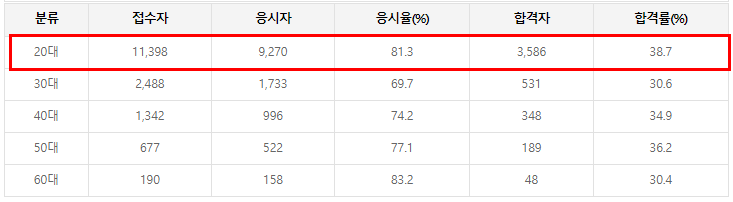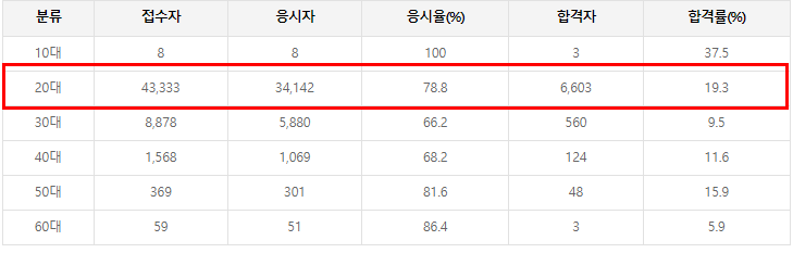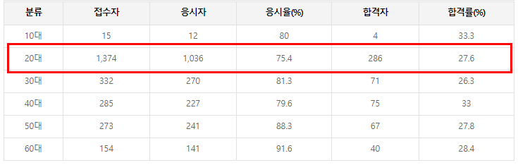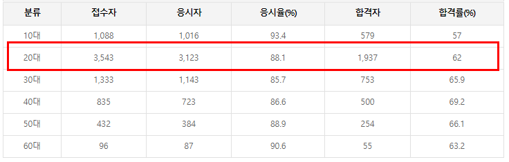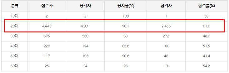 정보처리기사는 취준생의 필수 자격증이기 때문에 20대 합격자가 압도적으로 많은 편입니다.