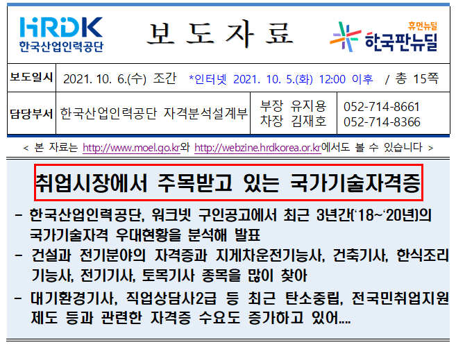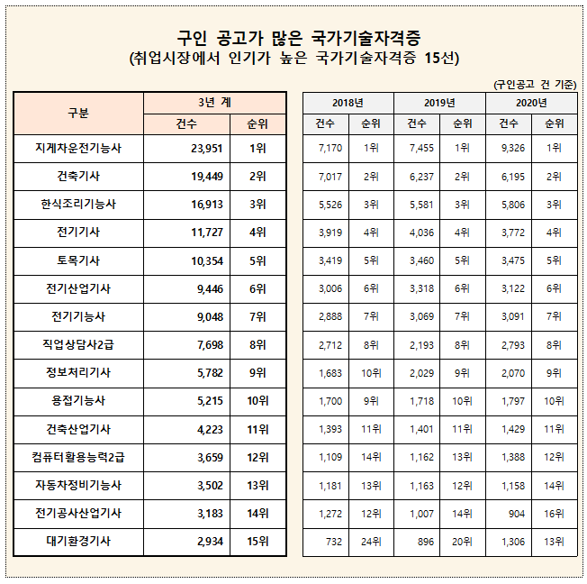 지난 10월 5일 한국산업인력공단과 고용노동부가 취업 잘 되는 국기 기술 자격증 Top 15을 발표했는데요. 2018년부터 2020년까지 최근 3년간 취업 포털 사이트인 워크넷(www.work.go.kr)의 구인공고에서 채용요건으로 정하거나 우대하고 있는 자격증, 즉 취업 시장에서 가장 인기가 높은 국가기술자격증을 선정했습니다.