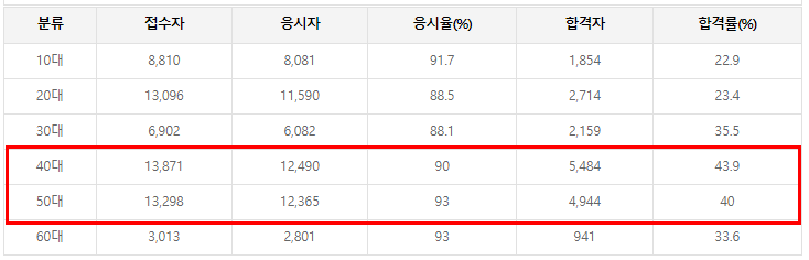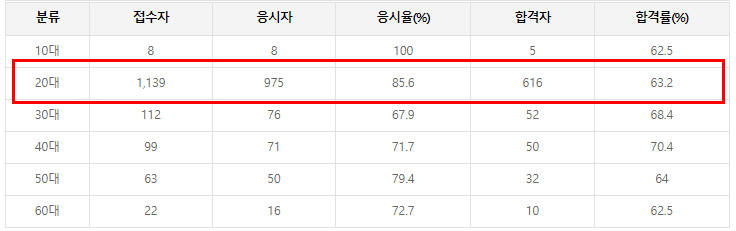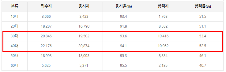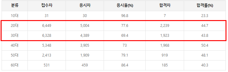 합격자 중 20대와 30대가 가장 많으며 합격률은 40대가 가장 높습니다.