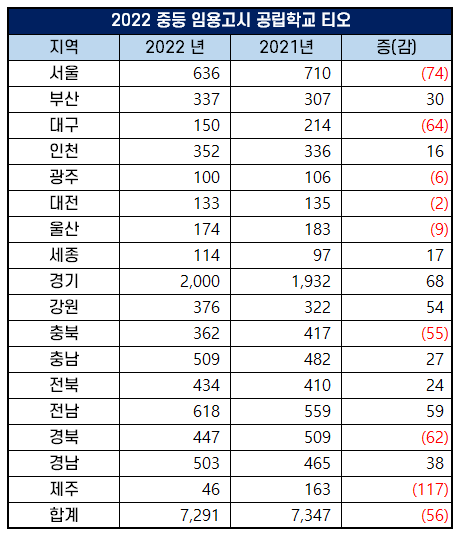 2022 지역별 공립학교 중등 임용고시 티오
