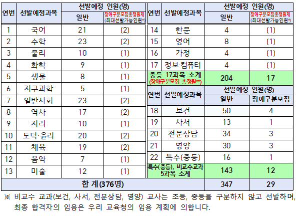2022년 강원도 교육청은 22개 과목에서 376명을 선발하는데요. 보건 과목이 50명을 선발해 가장 티오가 많고 중등 교과목 중에서는 수학과 일반사회 과목이 23명, 국어가 21명, 도덕·윤리 과목이 20명으로 티오가 많습니다.