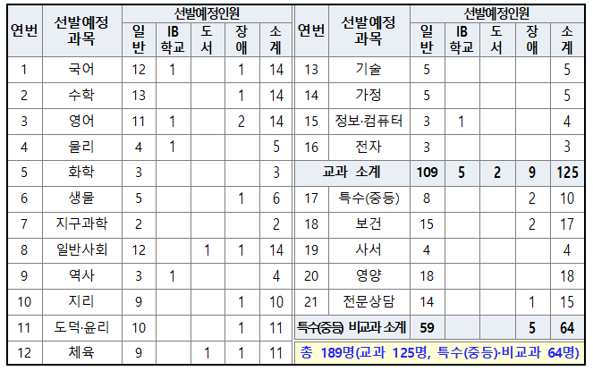 2022년 중등 임용고시 티오(선발예정인원)
