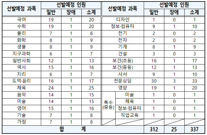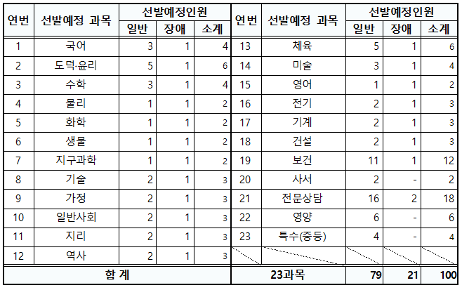 2023학년도 중등 교사 임용 고시 티오(선발예정인원) 2022년 10월 5일, 2023년 중등학교 교사와 특수(중등)·보건·영양·사서·전문상담교사를 선발하는 임용시험 시행계획이 공고되었습니다. 이번
