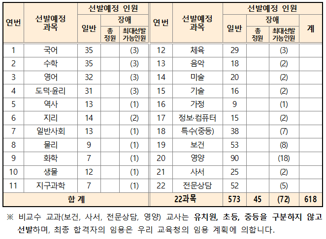 2022년 전라남도 교육청은 22개 과목에서 618명을 선발하는데요. 유치원, 초등, 중등을 구분하지 않고 선발하는 영양 과목이 90명, 보건 과목이 53명, 전문상담이 52명을 선발해 가장 티오가 많고 중등 교과목 중에서는 국어 과목과 수학 과목이 각각 35명을 선발해 티오가 가장 많습니다.